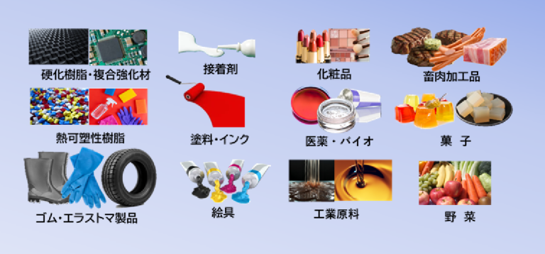 工業(化学、ゴム・プラ、接着、塗料、医薬、化粧)、 生活(農産物、食材、加工食品)