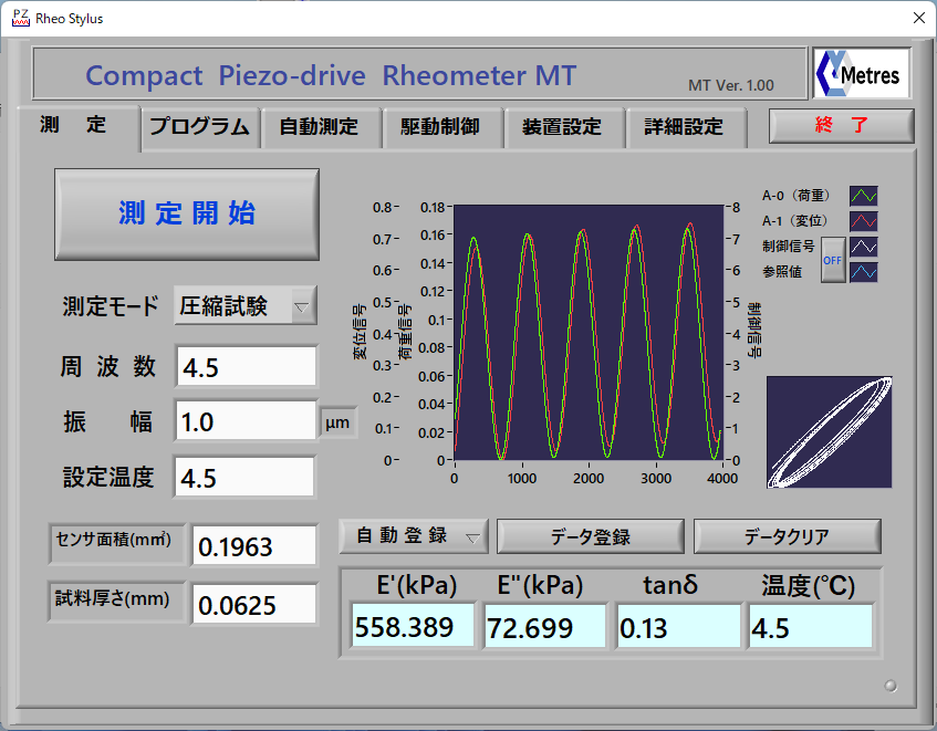 サンプルにセンサーを手動でセットし、測定開始ボタンを押すだけで、数秒間で測定結果を取得でき、測定波形とリサージュ図も確認できます。